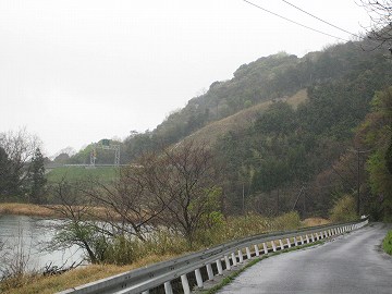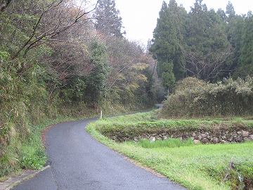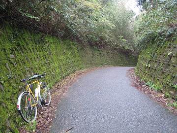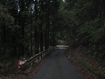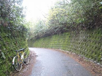 山間の狭い1車線の道をうねうねと登っていく。道は林に囲まれ、展望が効きそうなところはない。そうこうするうちに峠に到着。コンクリート製のブロックで切り通しの壁を覆ってある。その苔むし具合に歴史が感じられた。