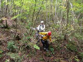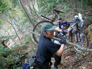 しかし、問題は崩落箇所である。崩落地点上部に沿って登り、自転車は手渡しで運ばざるを得ない。落ちそうな斜面に立ち、地滑りで倒れた木の上を乗り越え、やっとまともに歩ける地点へ出るのに20分以上かかった。