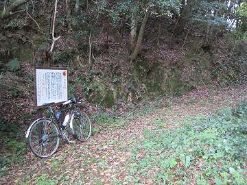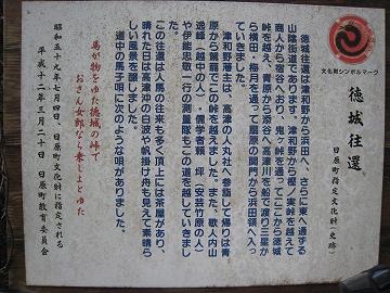 登りだして30分以上たち、高度的にも平行移動しだしたころ、看板が倒れている所に着いた。「史跡 徳城茶屋跡」の標柱がある。付近は木々に覆われているが、茶屋跡付近は平たくなっている。脇に倒れている看板は麓と同じような文面だが、途中が少し違っていた。