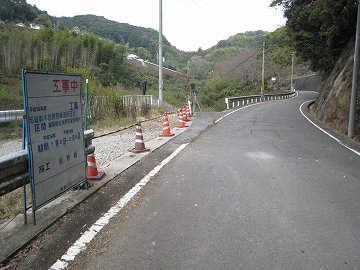 のっけから急坂である。いやコンクリート舗装であるから劇坂という方がふさわしい。崖っぷちの1車線道を曲がりながら登る。幅が広くややゆるやかになった所に工事中の看板があった。そしてその先に直角やヘアピンカーブを重ねて登る峠道が待ちかまえていた。