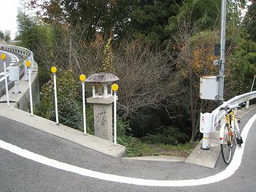 峠まで登ると、峠道は右上方から降りてくる道に合流する形になっていた。こういう場合、峠は3差路になっていたと表現すればいいのだろう。でも、じつは3差路ではなかった。交差点の灯籠の脇からひょっこっと顔を覗かせる道があるのだ。それは、もの凄く急勾配の山道だった。