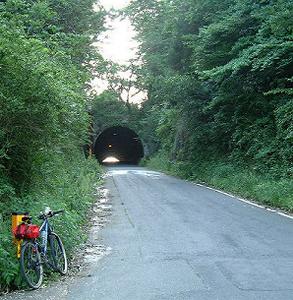 旧道はまっすぐ登っていっているが、峠はシェルター状のトンネルになっている。トンネルの中も結構な傾斜だ。峠の東側はクネクネ道で下のトンネルに合流している。