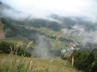 野沢温泉スキー場の初級者コースが旧道らしいが、初心者コースが林道になっているのでこちらから登る。あいにくの雨模様で展望自慢の道も形無しである。
