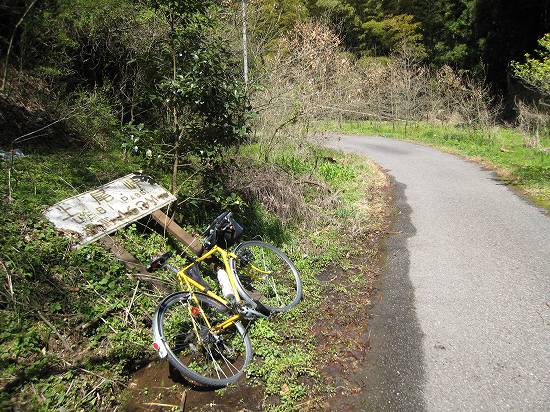 | 広田村の看板のそばに上尾峠の看板が倒れている。 じつは砥部町の看板のそばにも同じくらい古くなった峠の看板が立っているのだが、 木々に隠されて写せなかった。 |