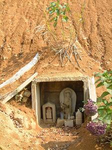 ダートになって約1時間、峠のログハウスが見えてきた。道端には崖の整備してないのり面にお地蔵さんが安置してあった。 |