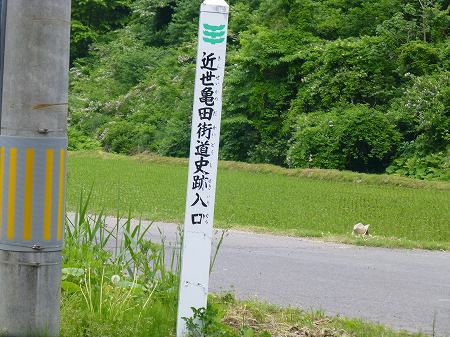 分岐点にはいわくありげな下のような道標が立てられていた。調べてみると、亀田街道は江戸時代、久保田藩の刈和野から亀田(松本清張の「砂の器」にも登場するね)までを呼んだそうだ。旧街道の峠としては由利長根を越えたらしい。峠道へ入る。車は離合しずらいだろうと思うくらいの道幅というだけであまり特徴はない。