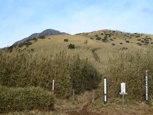 ・ 峠からは金時山が手に取るように見え、熊笹をかき分けていくかのような登山コースが伸びていた。