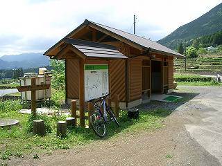 折山神社付近で阪本に出ると、きれいなトイレがあった。ここ阪本は紀州犬のふるさとなのだそうだ。紀州犬は野犬と狼の交配種だといわれており、秋田犬・土佐犬とともに国の天然記念物に指定されている ・ 阪本のトイレ