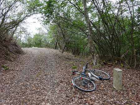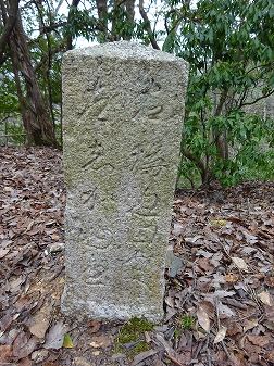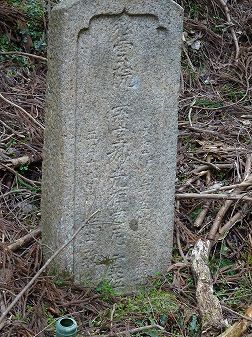 ダートの車道を少し行くと石造物が出てきた。最初のものはよく読めないが、たぶん行き倒れた女性のお墓と思われる。次に出てきたのは私の好物?石造りの道標。達筆すぎて何が書いてあるかわからない。ネット情報によると『右 梅迫田なへ 左 志加物遍』と書かれているとのこと。